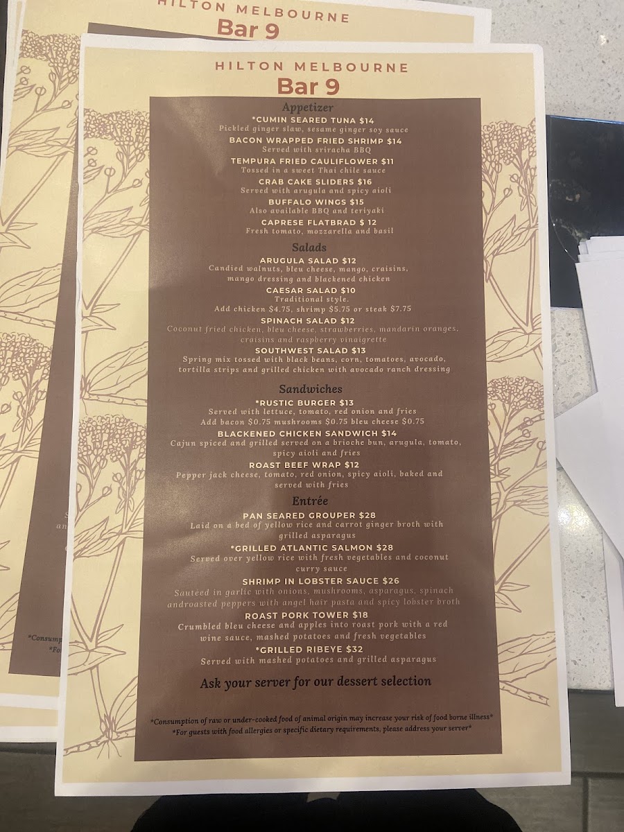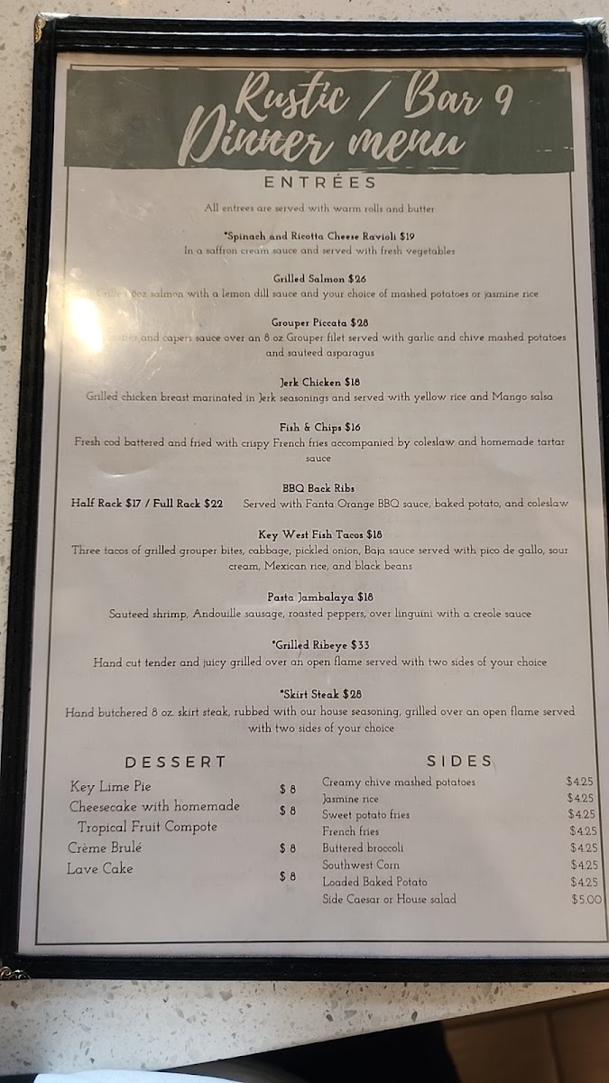 The menu at Rustic Restaurant & Bar 9 offers a wide array of delicious options to suit any craving. For those seeking a light and fresh start, the Havana Salad and Spinach Caprese Salad under "Market Greens" are flavorful choices. If you're in the mood for a hearty sandwich or wrap, the Certified Angus Burger and Creole Chicken Wrap are popular picks from the "In Bread We Trust" section. For something comforting, the Chicken & Sausage Gumbo and Lump Crab Cakes are sure to satisfy. The pizza menu features classics like Pepperoni and unique options like the Neptune and BBQ Chicken pizzas. For a more substantial meal, the "Family Favorites" section includes dishes like Filet of Beef Tenderloin and the flavorful Chicken Martinique. Accompany your meal with sides like Roasted Garlic Mashed Potatoes or Shallot and Herb Petite Baking Potatoes. To pair with your meal, the restaurant offers a variety of wines, such as the Pinot Gris from Joel Gott, Oregon, and Cabernet Sauvignon from Estancia Coast, California. For those looking to enjoy a refreshing cocktail, the Rustic Sun martini or indulgent Ice N Spice is an excellent choice. Don’t forget to finish your meal with a sweet treat like the decadent Signature Mile High Pie or the creamy Banana Foster Cheesecake. Rustic Restaurant & Bar 9 offers a well-rounded menu that caters to various tastes, making it a great destination for any occasion.